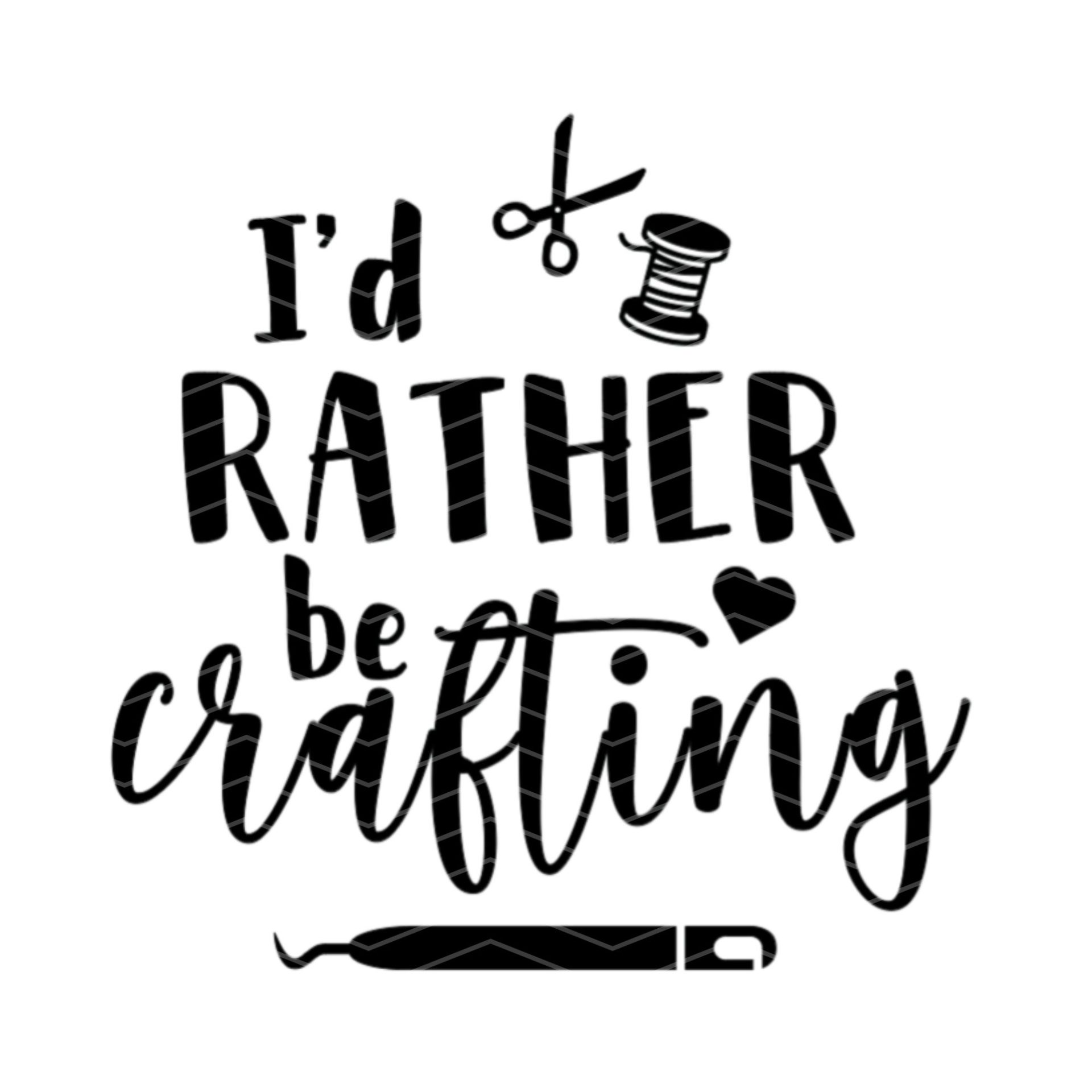 Texten ’I’d rather be crafting’ och pysselmaterial som weeding tool, trådrulle och sax.