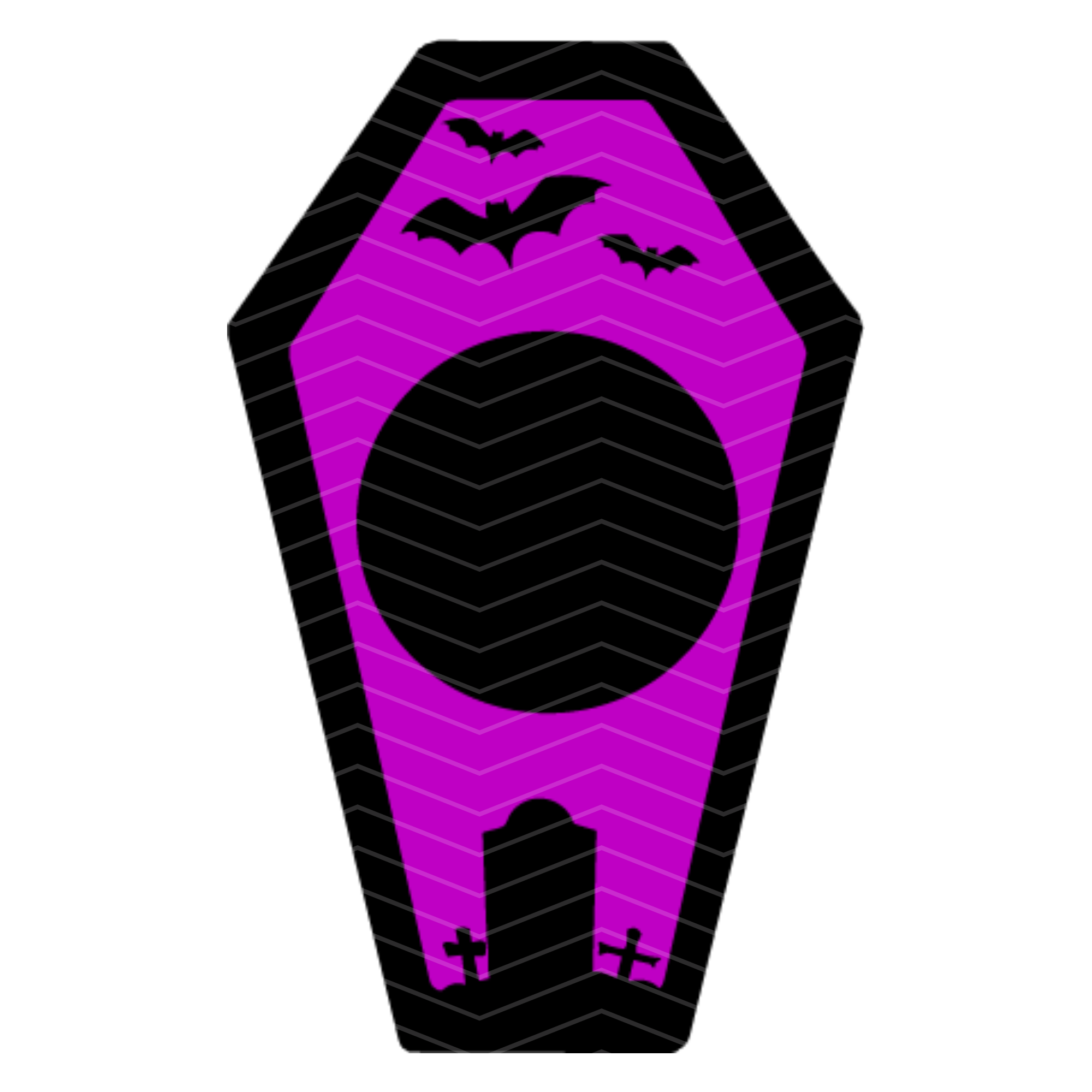 En stämningsfull kistdesign i svart och lila, dekorerad med fladdermöss och gravstenar. I mitten finns en yta där du kan fästa en delad julgranskula fylld med godis. En perfekt och lite kuslig detalj till Halloween som fungerar både som dekoration och som en rolig present vid ”bus eller godis” eller på Halloweenfesten.